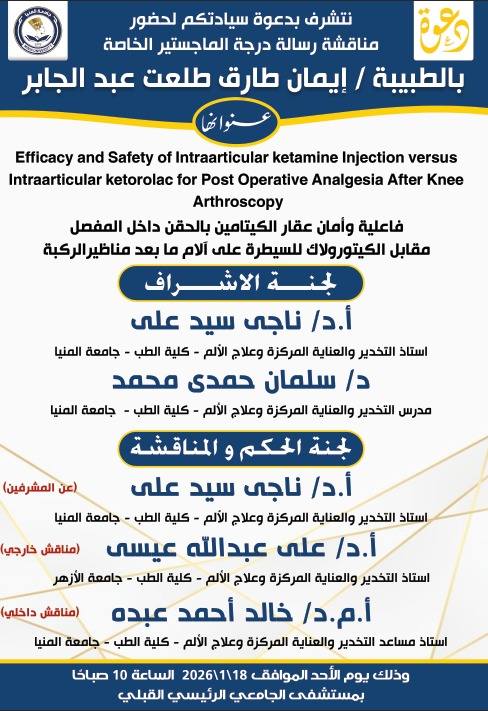 مناقشة رسالة الماجستير الخاصة بالطبيبة / ايمان طارق طلعت عبدالجابر طبيب مقيم بقسم التخدير والعناية المركزة وعلاج الألم يوم الاحد ١٨ \ ١ \ ٢٠٢٦ في قاعة المؤتمرات بالمبني التعليمي بمستشفى المنيا الجامعي تحت اشراف كلا من : أ.د/ ناجي سيد علي أستاذ التخدير والعناية المركزة وعلاج الألم كلية الطب جامعة المنيا د/ سلمان حمدي محمد مدرس التخدير والعناية المركزة وعلاج الألم كليه الطب جامعه المنيا ولجنة الحكم والمناقشة تكونت من كلا من : أ.د/ ناجي سيد علي أستاذ التخدير والعناية المركزة وعلاج الألم كلية الطب جامعة المنيا (عن المشرفين) أ.د/ علي عبدالله عيسي أستاذ التخدير والعناية المركزة وعلاج الألم كلية الطب جامعة الازهر (مناقش خارجي) أ.م.د/ خالد احمد عبده أستاذ مساعد التخدير والعناية المركزة وعلاج الألم كلية الطب جامعة المنيا (مناقش داخلي)