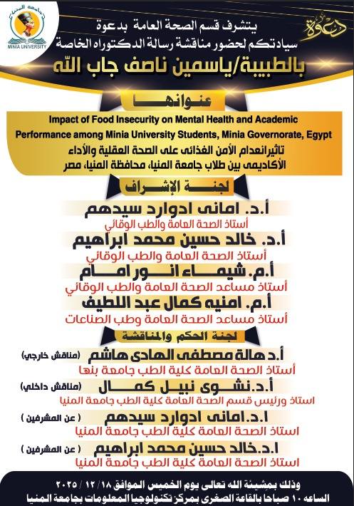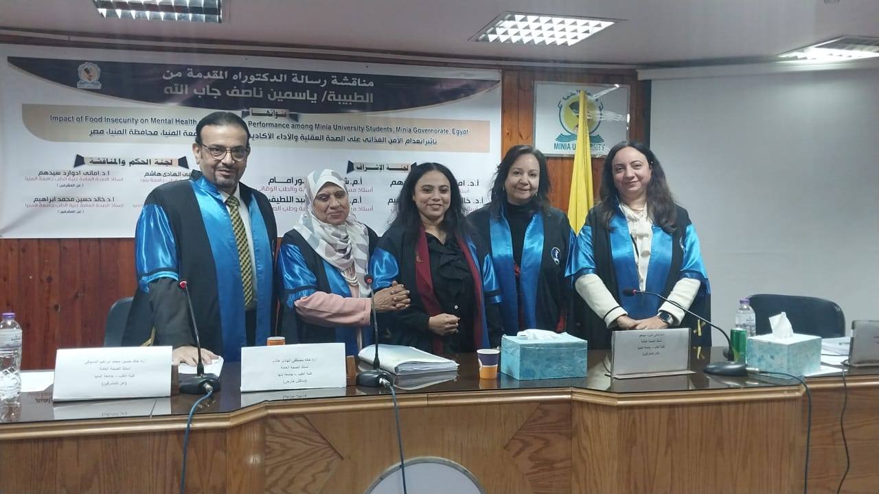 تمت مناقشة رسالة الدكتوراه الخاصة بالطبيبة ياسمين ناصف جاب الله المدرس المساعد بقسم الصحة العامة والطب الوقائي يوم ١٨/١٢/٢٠٢٥ والتي كانت بعنوان: تاثير انعدام الأمن الغذائى على الصحة العقلية والأداء الأكاديمى بين طلاب جامعة المنيا، محافظة المنيا، مصر العنوان بالغة الانجليزية Impact of Food Insecurity on Mental Health and Academic Performance among Minia University Students, Minia Governorate, Egypt وكانت تحت اشراف كل من: أ.د. امانى ادوارد سيدهم أستاذ الصحة العامة والطب الوقائي أ.د. خالد حسين محمد ابراهيم الدسوقي أستاذ الصحة العامة والطب الوقائي أ.م. شيماء انور امام أستاذ مساعد الصحة العامة والطب الوقائي أ.م. امنيه كمال عبد اللطيف أستاذ مساعد الصحة العامة وطب الصناعات وتكونت لجنة المناقشة من كل من: ا.د هالة مصطفى الهادى هاشم استاذ الصحة العامة كلية الطب جامعة بنها (مناقش خارجى) ا.د.نشوى نبيل كمال استاذ ورئيس قسم الصحة العامة كلية الطب جامعة المنيا (مناقش داخلى) ا.د.امانى ادوارد سيدهم استاذ الصحة العامة كلية الطب جامعة المنيا (عن المشرفين) ا.د.خالد حسين محمد ابراهيم الدسوقى استاذ الصحة العامة كلية الطب جامعة المنيا (عن المشرفين)