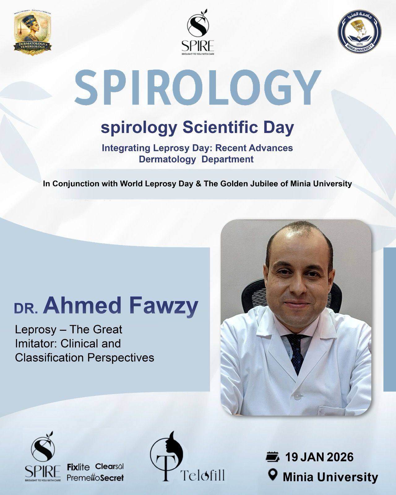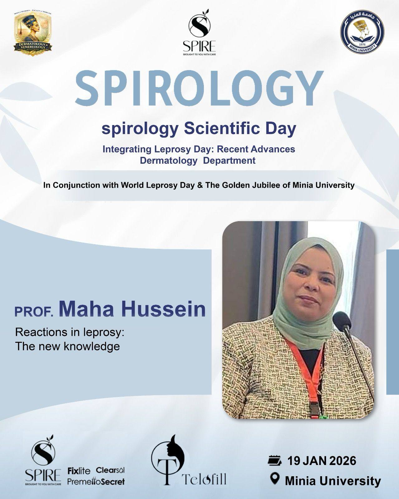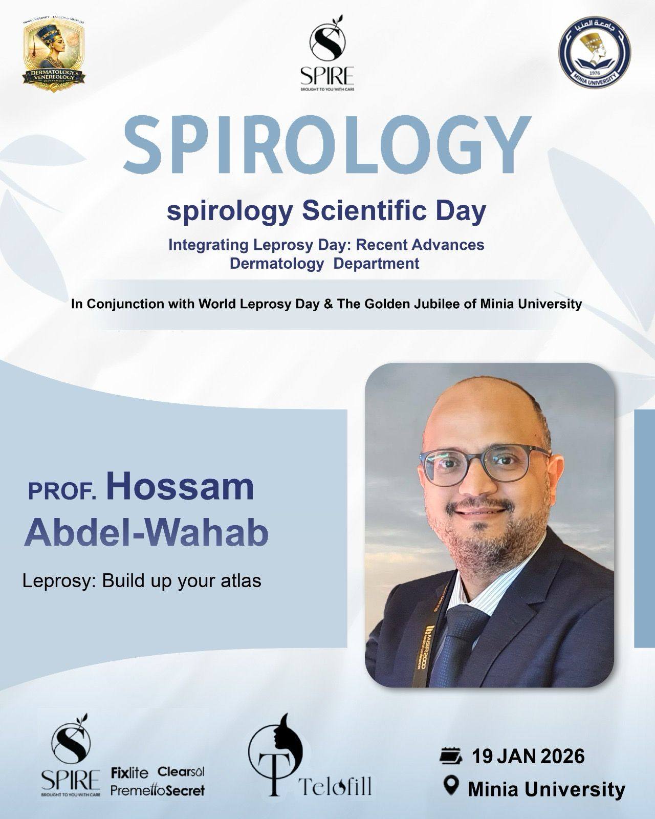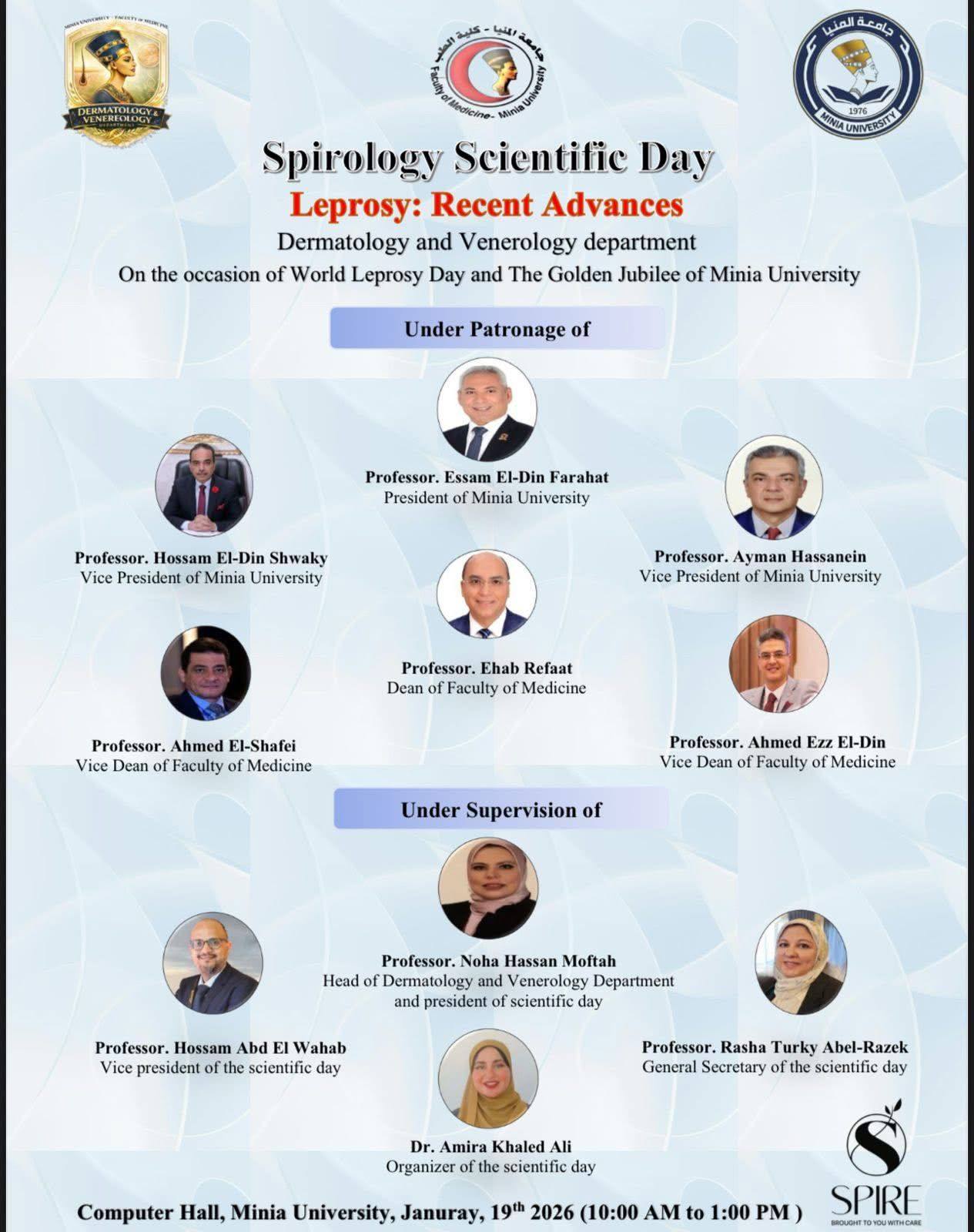 يتشرف قسم الأمراض الجلدية والتناسليه جامعه المنيا برئاسه الاستاذه الدكتوره/ نهى حسن مفتاح بدعوة سيادتكم لحضور اليوم العلمى لمرض الجزام تحت عنوان Leprosy day : Recent advances وذلك يوم الاثنين المقبل الموافق 19/1/2026 وذلك تزامناً مع الاحتفال باليوبيل الذهبى لجامعة المنيا واليوم العالمى لمرض الجزام بالقاعة الكبرى بمركز التكنولوجيا والمعلومات بالجامعه الساعة 10 صباحاً تحت رعاية كليه الطب جامعة المنيا حيث الإلقاء العلمى الشيق والمثمر من أساتذة القسم وهم كالتالى: الاستاذه الدكتوره/ نهى حسن مفتاح الاستاذ الدكتور/ حسام محمد عبد الوهاب الأستاذة الدكتورة/ رشا تركى عبدالرازق الاستاذه الدكتوره/مها حسين قنديل الأستاذ الدكتور/ أحمد فوزى رزق الدكتور/ ميشيل راجى حنا الدكتور / المصطفى محمد احمد #Spirology #Telofill #Spire