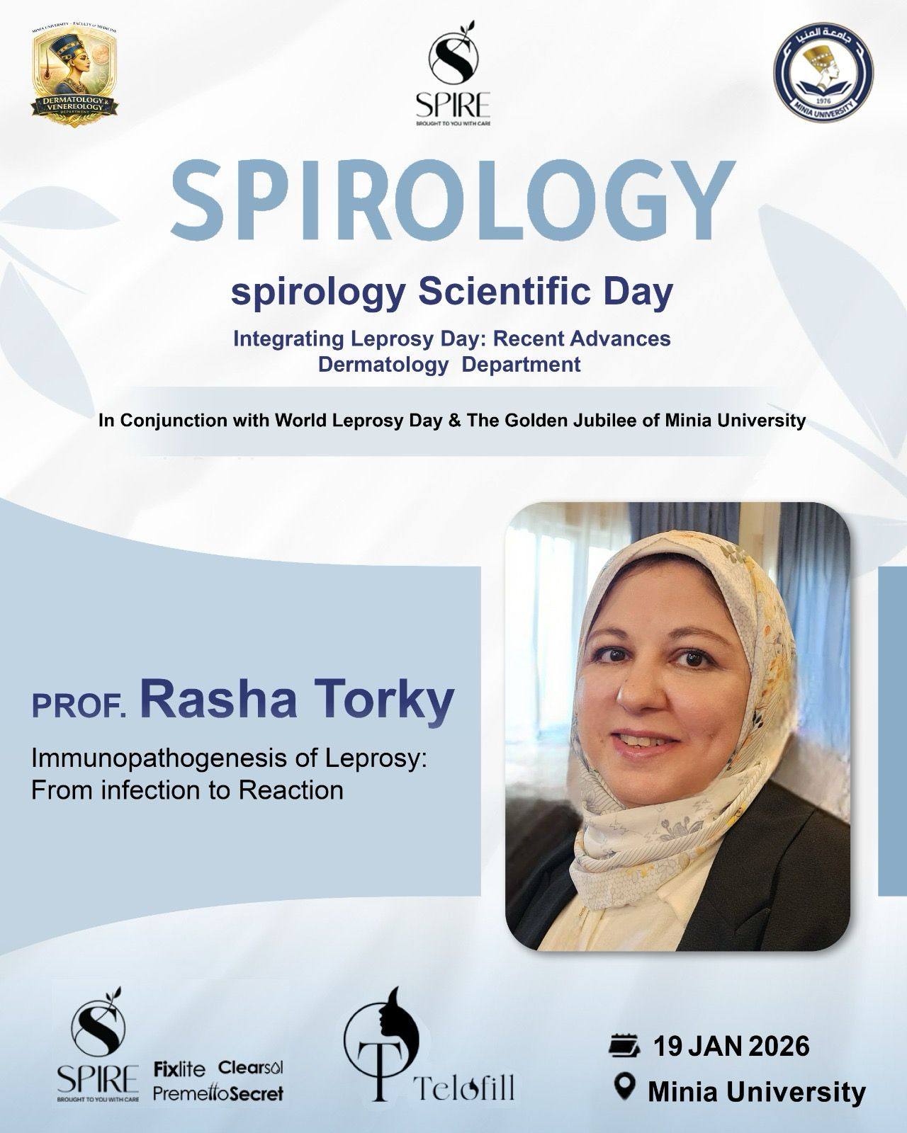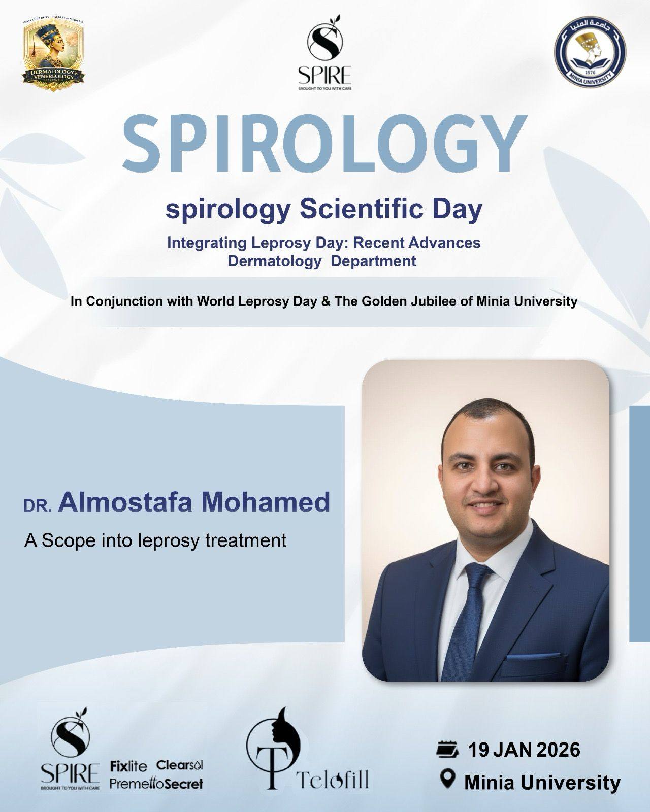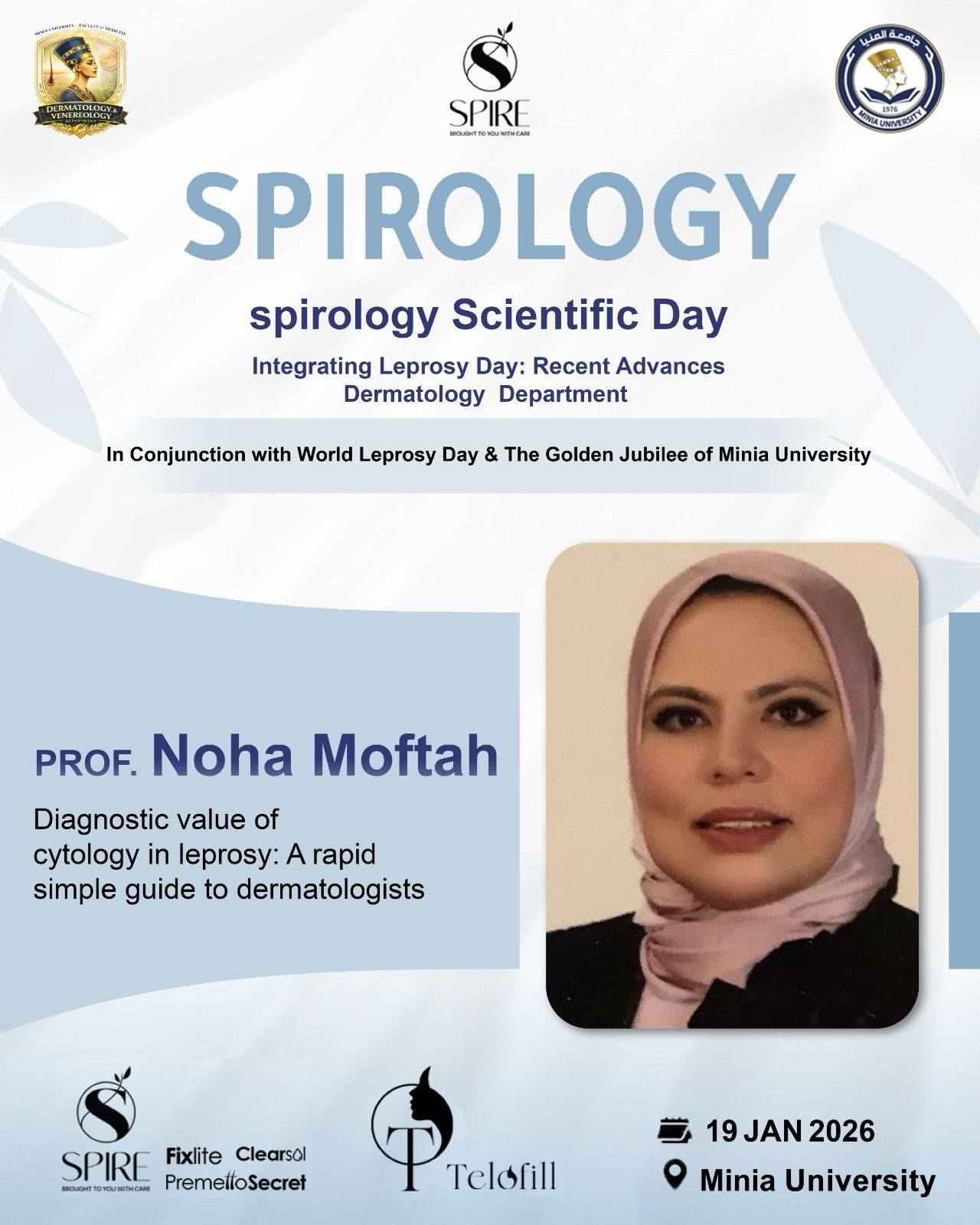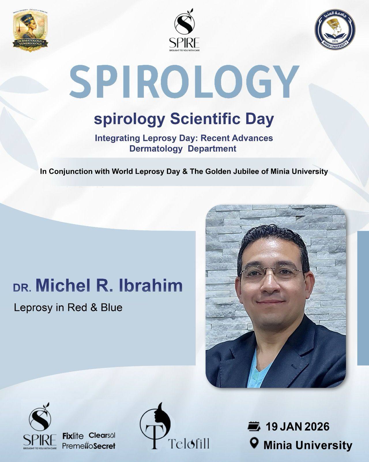 يتشرف قسم الأمراض الجلدية والتناسليه جامعه المنيا برئاسه الاستاذه الدكتوره/ نهى حسن مفتاح بدعوة سيادتكم لحضور اليوم العلمى لمرض الجزام تحت عنوان Leprosy day : Recent advances وذلك يوم الاثنين المقبل الموافق 19/1/2026 وذلك تزامناً مع الاحتفال باليوبيل الذهبى لجامعة المنيا واليوم العالمى لمرض الجزام بالقاعة الكبرى بمركز التكنولوجيا والمعلومات بالجامعه الساعة 10 صباحاً تحت رعاية كليه الطب جامعة المنيا حيث الإلقاء العلمى الشيق والمثمر من أساتذة القسم وهم كالتالى: الاستاذه الدكتوره/ نهى حسن مفتاح الاستاذ الدكتور/ حسام محمد عبد الوهاب الأستاذة الدكتورة/ رشا تركى عبدالرازق الاستاذه الدكتوره/مها حسين قنديل الأستاذ الدكتور/ أحمد فوزى رزق الدكتور/ ميشيل راجى حنا الدكتور / المصطفى محمد احمد #Spirology #Telofill #Spire