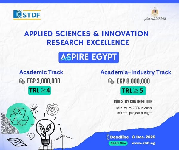 التعليم العالي: فتح باب التقدم للنداء الرابع من برنامج "التميّز في العلوم التطبيقية والابتكار" (ASPIRE Egypt) بتمويل يصل إلى ٨ ملايين جنيه للمشروع من هيئة تمويل العلوم والتكنولوجيا والابتكار